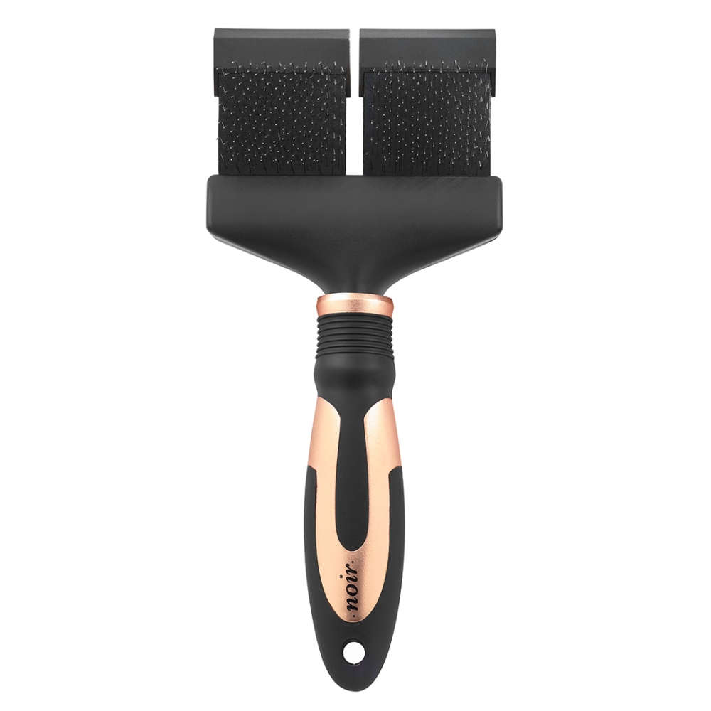 Diese flexible Slicker-Bürste von Noir hat weiche Edelstahl-Borsten zum wirksamen Entfernen von abgestorbenem Haar und Schmutz. Der flexible Kopf passt sich der Körperform perfekt an. Die Bürste hat auf der einen Seite gerade Borsten und auf der anderen Seite gebogene Borsten. Die gebogenen Borsten dünnen das dicke Unterfell schonend und ohne Hautreizung aus und entfernen Knoten und Kletten. Die geraden Borsten pflegen das Fell und sorgen für einen natürlichen Glanz. Der ergonomische Griff ist aus robustem ABS-Kunststoff für mehr Komfort für das Herrchen. Die Bürste ist für alle Katzen- und Hunderassen geeignet.