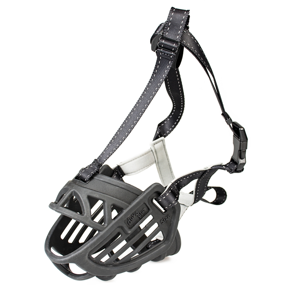 Der duvoplus Maulkorb aus starkem, strapazierfähigem Gummi kombiniert auf perfekte Weise Komfort für den Hund mit Sicherheit für den Halter. Die Kiefer Ihres Hundes werden zusammengehalten, sodass er nicht beißen, kauen oder bellen kann. Ihr Hund hat ausreichend Platz zum Trinken, Hecheln und um eine Belohnung zu erhalten. Durch die ergonomische, biegsame Passform und das Neoprenfutter rund um das Kinn ist der Maulkorb sehr komfortabel. Die drei Befestigungsmöglichkeiten sorgen für optimale Sicherheit. Befestigen Sie den Riemen mit den Klickverschlüssen mit Schiebeschloss um den Nacken und ziehen Sie das Band an. Der Stirnriemen ist ebenfalls anpassbar. Spannen Sie den Maulkorb nicht fester als erforderlich an! Für zusätzliche Sicherheit können Sie die Sicherheitsschlaufen unter dem Kinn und hinter dem Nacken am normalen Halsband Ihres Hundes befestigen. Die reflektierenden Streifen garantieren eine optimale Sichtbarkeit im Dunkeln, um gemeinsam mit Ihrem Hund sicher loszuziehen.