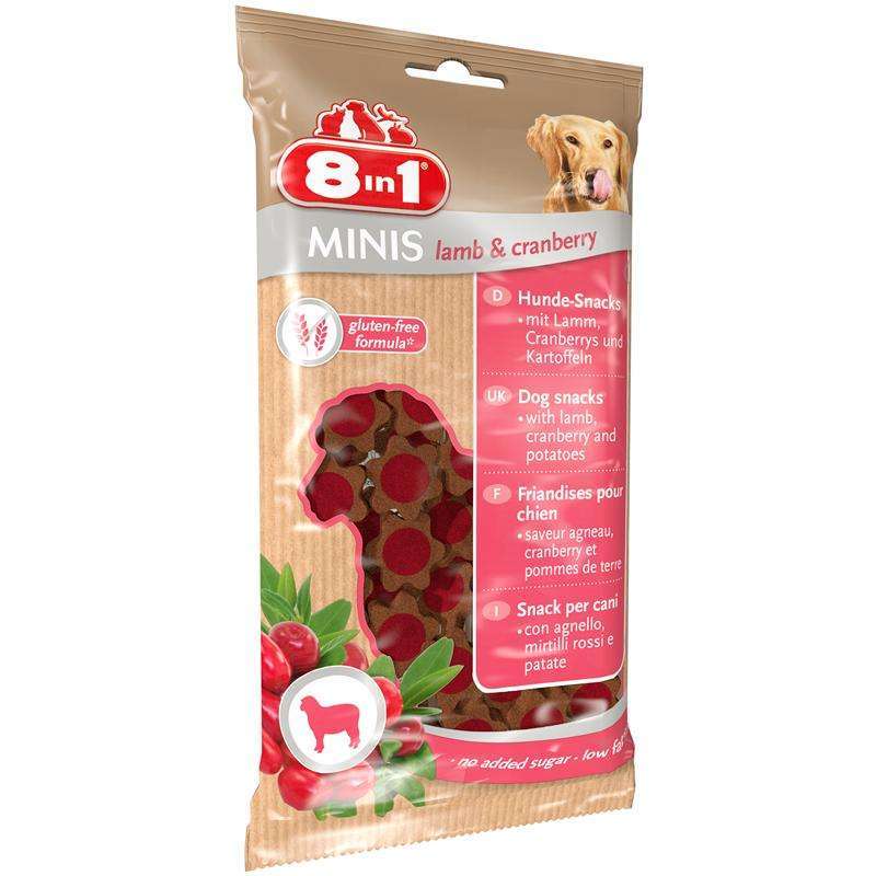 8in1 Minis lamb & cranberry sind leckere Snacks mit Lamm und Cranberry. Die schmackhafte Rezeptur mit Kartoffeln enthält kein glutenhaltiges Getreide.