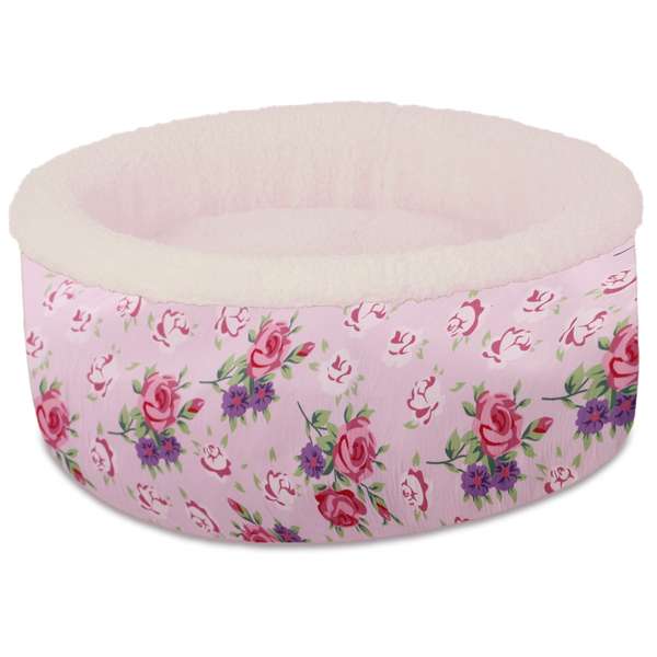Rundes Katzenbettchen mit rosa Blümchenstoff außen und kuschelweichem rosa Plüsch innen. Das lose Kissen hat eine Plüsch- und eine Blümchenstoff-Seite, sodass es je nach Laune gewendet werden kann. Der Nylonboden ist an der Unterseite mit kleinen Noppen für die Rutschfestigkeit versehen.