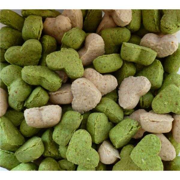 Ergänzungsfuttermittel für Hunde. Für unsere kleinen Herzchen. Rein pflanzlicher Genuss mit der extra Portion Gemüse aus Luzerne, Erbsen und Petersilie.