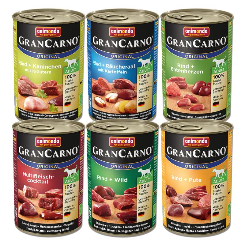 Je eine GranCarno 400g Dose der Varietäten Multi- Fleischcocktail, Rind + Pute, Rind + Wild, mit Pute + Ente, mit Räucheraal + Kartoffeln und mit Kaninchen + Kräuter.