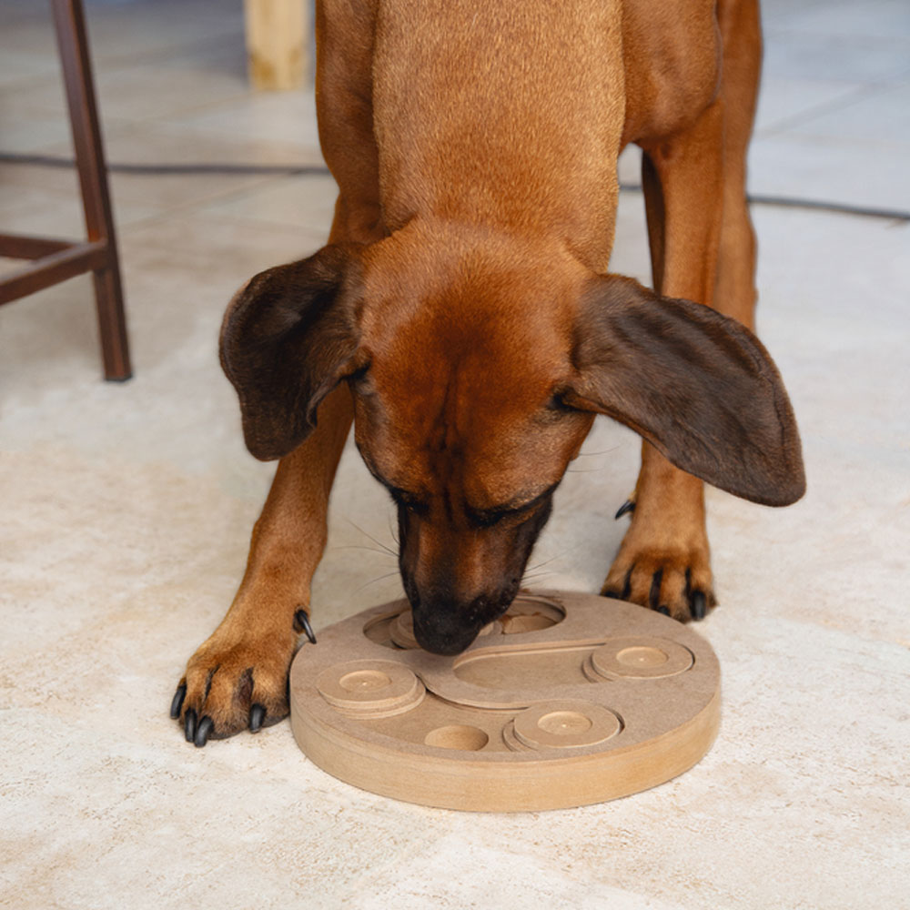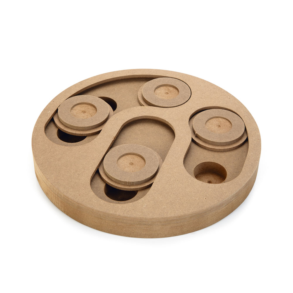 Das Beeztees Braingame Giono fordert deinen Hund auf spielerische Weise physisch und mental heraus, da er hier auf der Suche nach den versteckten Snacks verschiedene "Hürden" überwinden muss. Giono kann auf beiden Seiten bespielt werden, so kannst du euer gemeinsames Spiel abwechslungsreich gestalten. Auf einer Seite muss dein Hund die Schieber mit seiner Pfote/ Schnauze bewegen, um an die Leckereien heran kommen zu können, auf der anderen Spielseite muss dein Hund dazu die Holz-Hütchen entfernen. Wenn du jedes Mal andere Verstecke wählst, bleibt das Spiel für deinen Hund spannend und interessant.