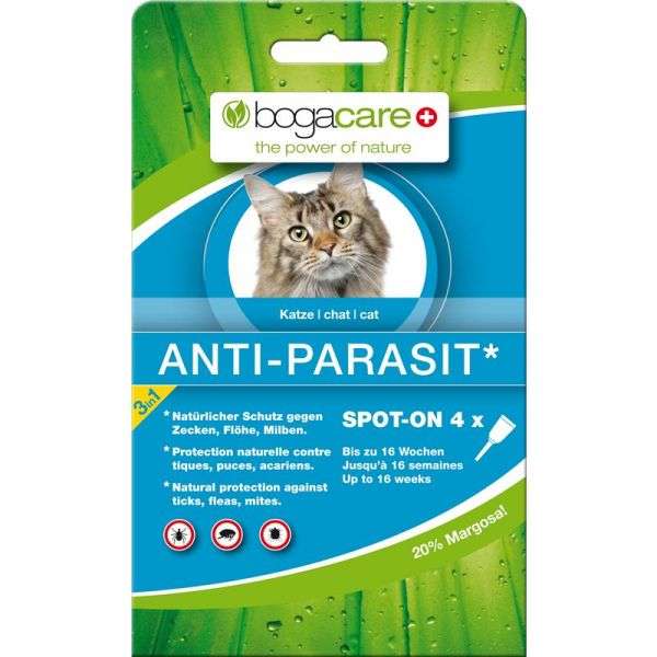 bogacare®ANTI-PARASIT Spot-on gegen Zecken, Flöhe und Milben basiert auf der iedealen Kombination von Margosa-Extrakt und einem nach strengen Kriterien ausgewählten Lavendel- und Citronellaöl. Die besondere Formulierung mit dem natürlichen Wirkstoff Margosa, der europaweit als repellierender Biozidwirkstoff zugelassen ist, wirkt sanft aber effektiv gegen Zecken, Flöhe und Milben. Die spezielle Formulierung zieht schnell ein, ist hautverträglich und sicher in der Anwendung.