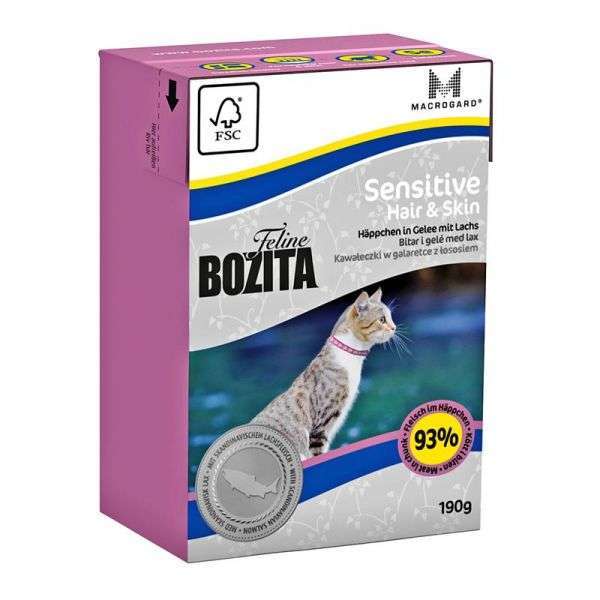 Bozita Feline Sensitive Hair & Skin Häppchen in Gelee ist ein speziell für Langhaarkatzen und für Katzen mit Haut- und Fellproblemen entwickeltes Futter.