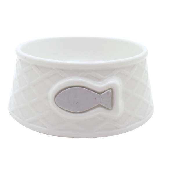 Weißer Keramiknapf in ansprechendem Design mit Fisch-Dekor.