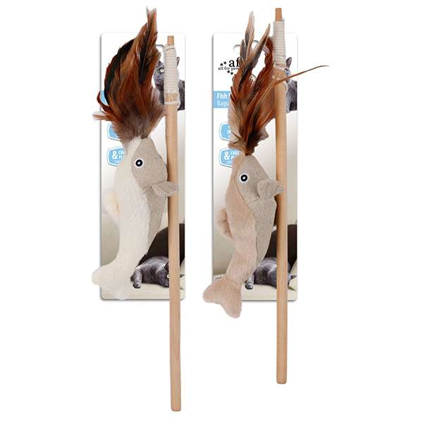 Die Angel mit fester Schnur, an der ein flauschiger Plüsch-Fisch mit weichen Federn befestigt ist, wird den natürlichen Jagd- und Spieltrieb Ihrer Katze anregen. Sie wird es lieben, den Fisch zu fangen und letztendlich zu erbeuten. Durch den stabilen Holzstab hält die Angel selbst dem stärksten Stubentiger stand.