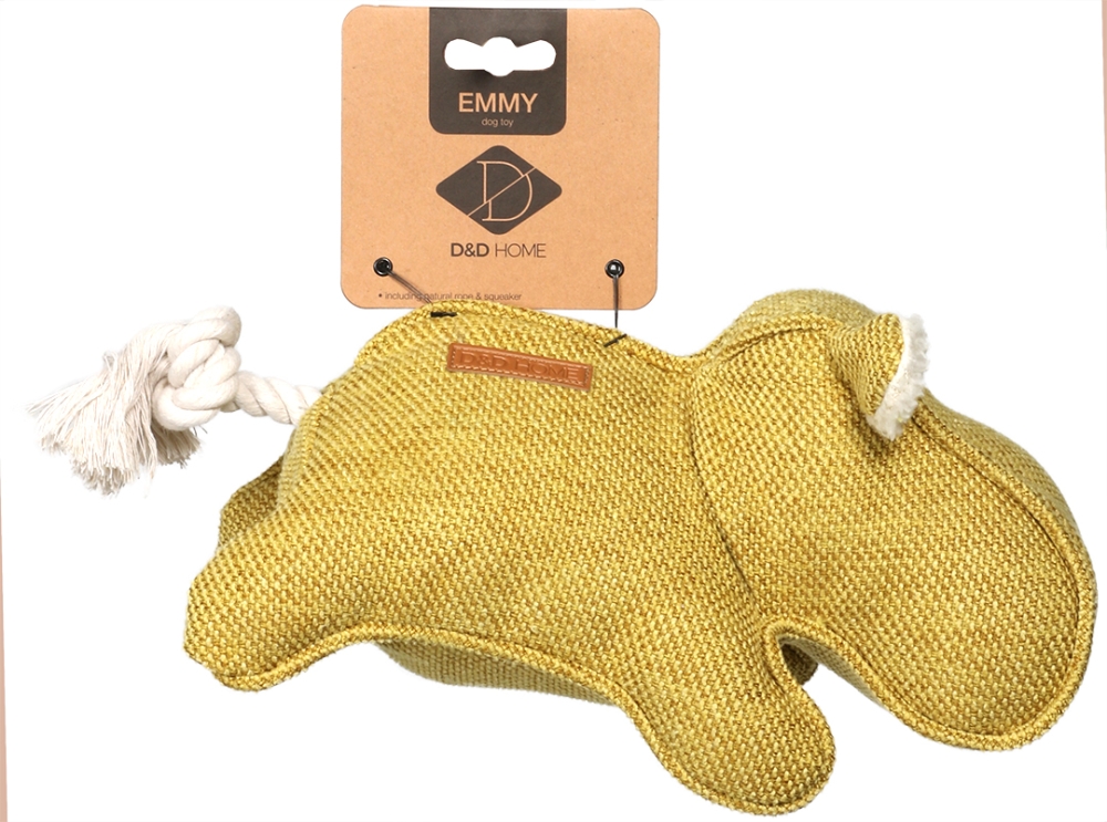 Jeder Hund sollte das Hundespielzeug Emmy von D&D HOME haben. Dieses strapazierfähige Spielzeug in Form eines Nilpferds aus attraktivem Chenille ist mit Polyester gefüllt. Emmy hat einen Schwanz aus Baumwollschnur und in der Nase befinden sich 2 Quietscher für noch mehr Spielspaß. Dank des attraktiven Designs und der modernen Farbe passt das Spielzeug perfekt in jedes Interieur. Auch in anderen Stoffen und Modellen erhältlich.