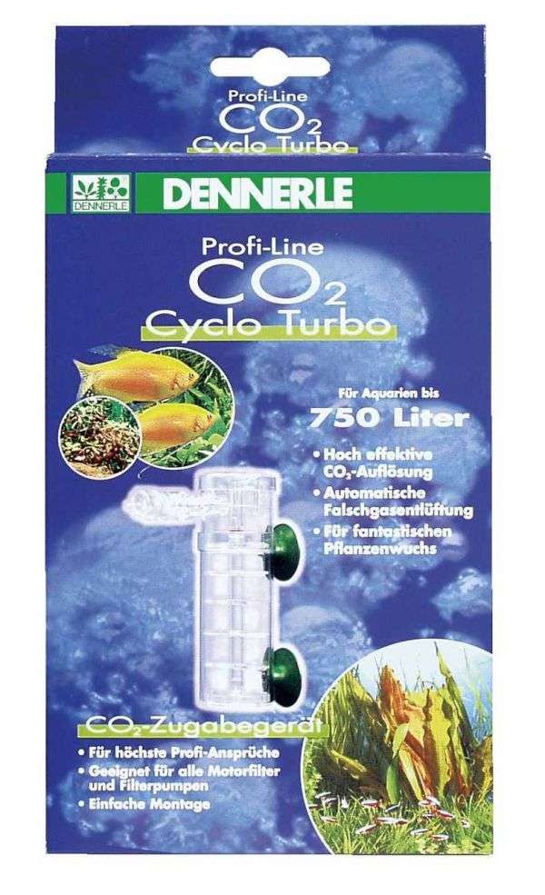 Funktionsweise: Das CO2 tritt unten im Cyclo an der Öffnung des CO2-Rohres aus. Von hier aus steigen die Blasen nach oben und sammeln sich unter den einzelnen Stufen des Turbo-Einsatzes. Das vom Filterauslauf oder einer separaten Pumpe kommende Wasser dagegen strömt in einer Wirbelbewegung an den so festgehaltenen CO2-Blasen vorbei nach unten. Durch dieses, auch in der Natur häufig realisierte Gegenstromprinzip löst sich das CO2 äußerst schnell und effektiv. Das mit CO2 angereicherte Wasser fließt am unteren Ende der Wirbelkammer ins Aquarium.