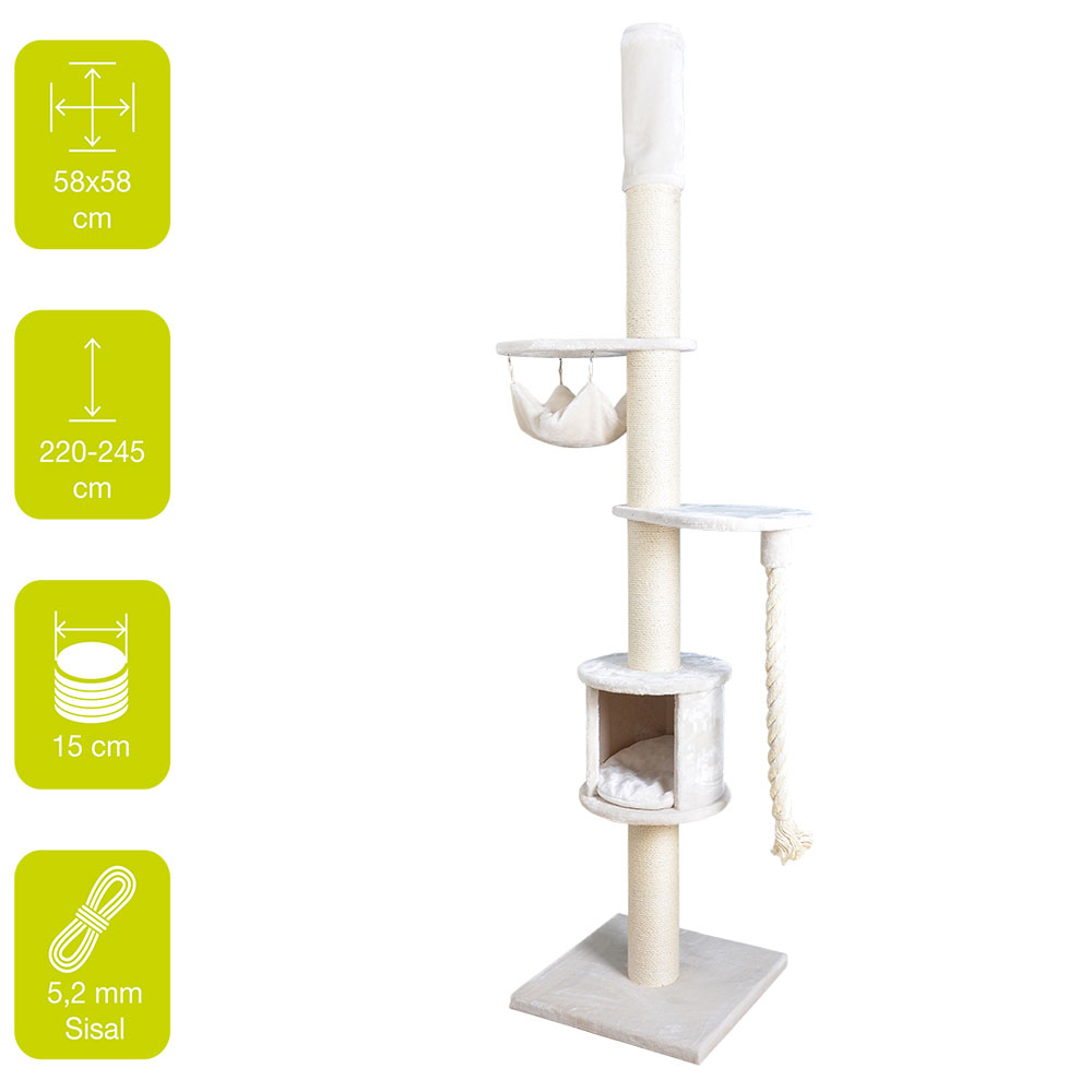 Der Kratzbaum hat alles was sich eine Katze wünscht: er ist robust dank der Befestigung zwischen Boden und Decke, man kann bis zur Decke klettern, die Sisalpfähle sind bis zu 15 cm dick, es gibt eine komfortable Hütte, 2 Plattformen, eine Hängematte oben und eine dicke Spielkordel.