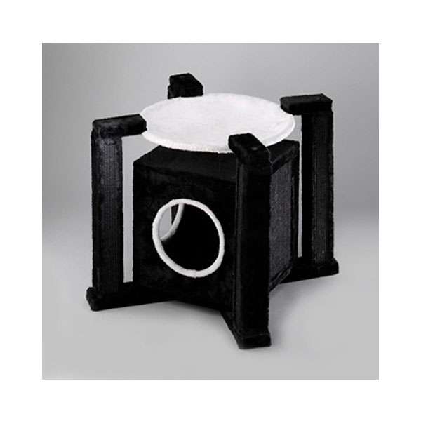 Der Kratzbaum mit besonders schwerer Qualität besteht aus einer viereckigen Höhle, die von zwei Seiten über einen weiß eingefassten Eingang erreichbar ist. An einer der anderen beiden Seiten befindet sich eine Sisal-Kratzfläche, die wie die Höhle selbst in schwarz gehalten ist. Auch die quadratischen Stämme sind an einigen Seiten mit Sisal-Flächen bestückt, so ist ausreichend Platz zum Krallenschärfen für Ihre Samtpfote vorhanden.