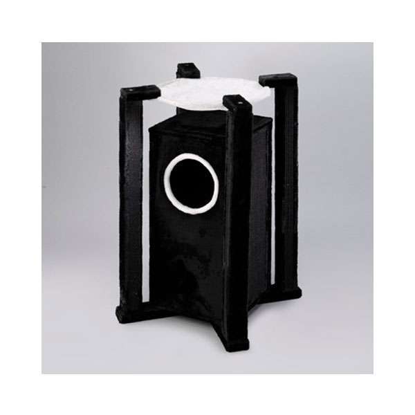 Der Kratzbaum mit besonders schwerer Qualität besteht aus einer viereckigen Höhle mit zwei getrennten Etagen, die durch weiß eingefasste Eingänge an verschiedenen Seiten der Tonne zu erreichen sind. An einer der anderen beiden Seiten befindet sich eine Sisal-Kratzfläche, die wie die Höhle selbst in schwarz gehalten ist. Auch die quadratischen Stämme sind an einigen Seiten mit Sisal-Flächen bestückt, so ist ausreichend Platz zum Krallenschärfen für Ihre Samtpfote vorhanden.