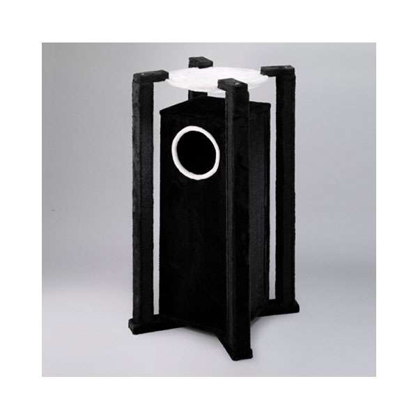 Der Kratzbaum mit besonders schwerer Qualität besteht aus einer viereckigen Höhle mit drei getrennten Etagen, die durch wieß eingefasste Eingänge an verschiedenen Seiten der Tonne zu erreichen sind. An der letzten Seiten befindet sich eine Sisal-Kratzfläche, die wie die Höhle selbst in schwarz gehalten ist. Auch die quadratischen Stämme sind an einigen Seiten mit Sisal-Flächen bestückt, so ist ausreichend Platz zum Krallenschärfen für Ihre Samtpfote vorhanden.