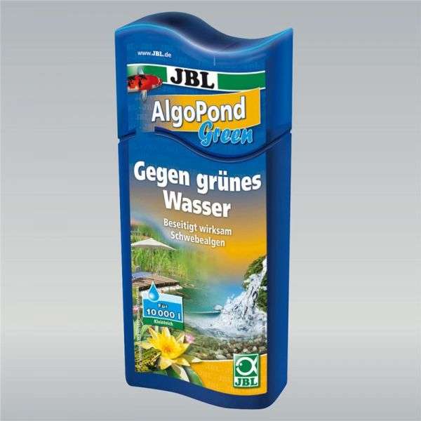 Gruenes Wasser wird im Teich durch Schwebealgen verursacht, die durch JBL AlgoPond Green abgetoetet werden. Die abgetoeteten Algen werden von Bakterien im Teich abgebaut. Keine schaedlichen Auswirkungen auf das biologische Gleichgewicht des Teiches. Wasser vor Anwendung mit JBL PondCheck ueberpruefen, da KH mind. 4 Grad dKH betragen muss. Sollte morgens angewendet werden, da dann der pH-Wert am niedrigsten ist. Biozide sicher verwenden. Vor Gebrauch stets Kennzeichnung und Produktinformation lesen!