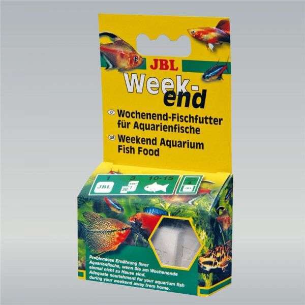JBL Weekend Wochenend-Fischfutter dient zur problemlosen Ernaehrung Ihrer Aquarienfische, wenn Sie am Wochenende einmal nicht zu Hause sind. Es enthaelt alle Bestandteile, die fuer eine gesunde Ernaehrung der Fische wichtig sind: Getreide, Fisch und Fischnebenerzeugnisse, pflanzliche Nebenerzeugnisse, Hefen, Algen sowie tierische Nebenerzeugnisse. Alleinfutter-gefaerbt mit EWG-Zusatzstoffen.