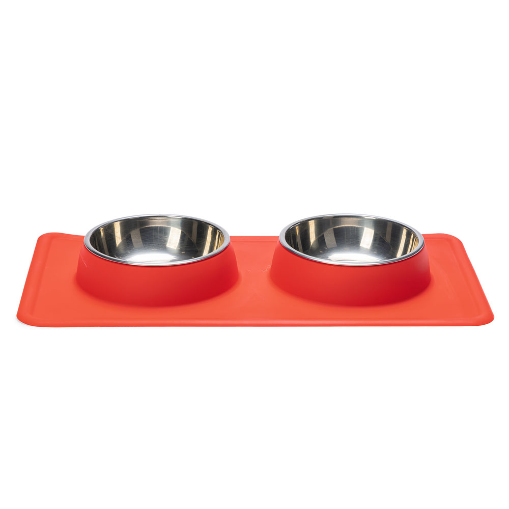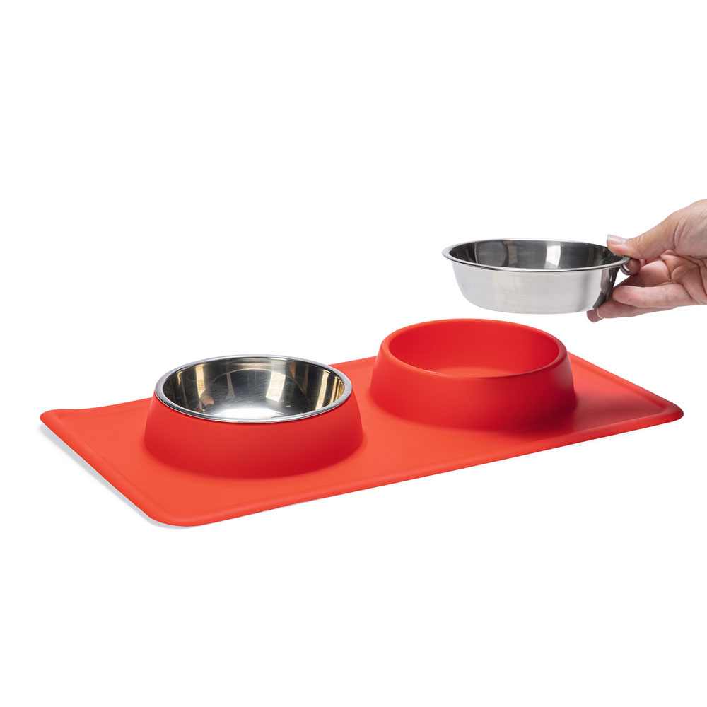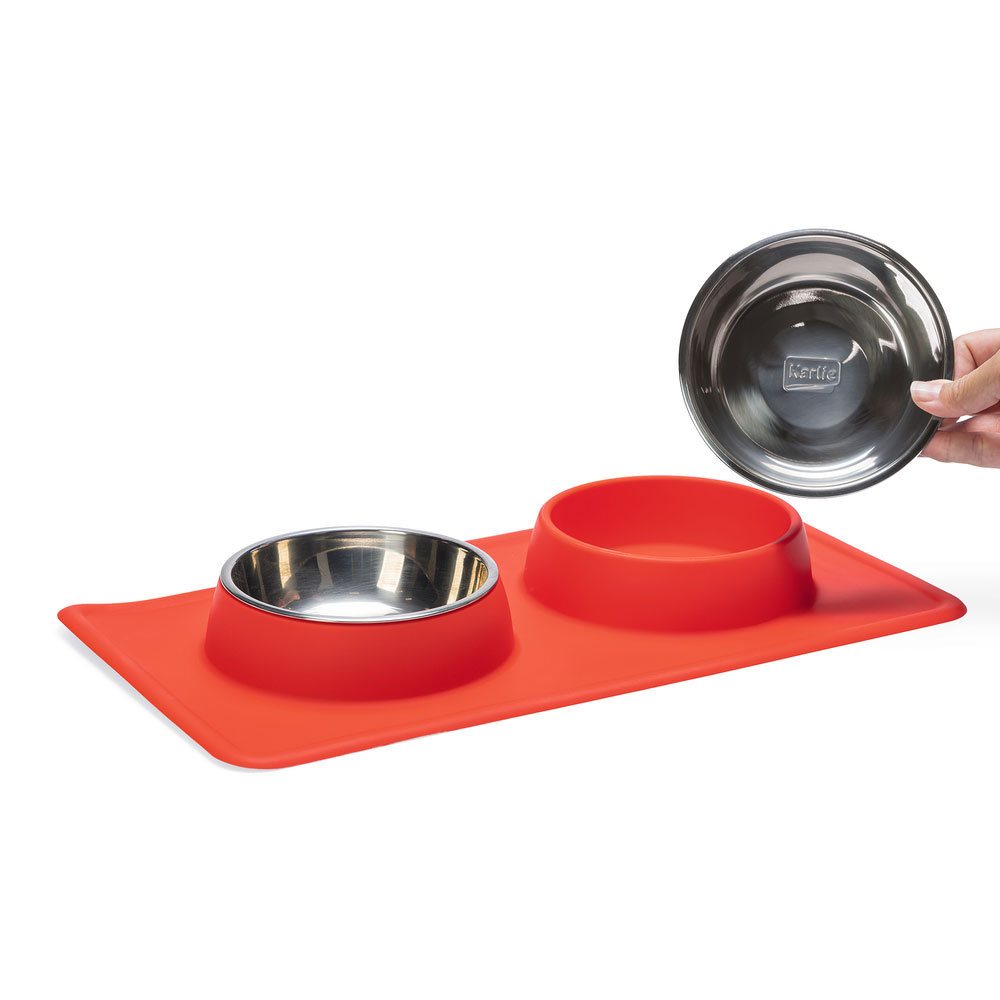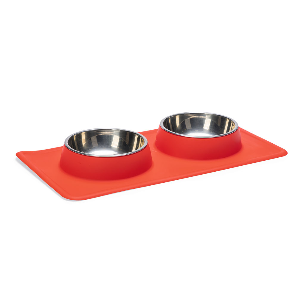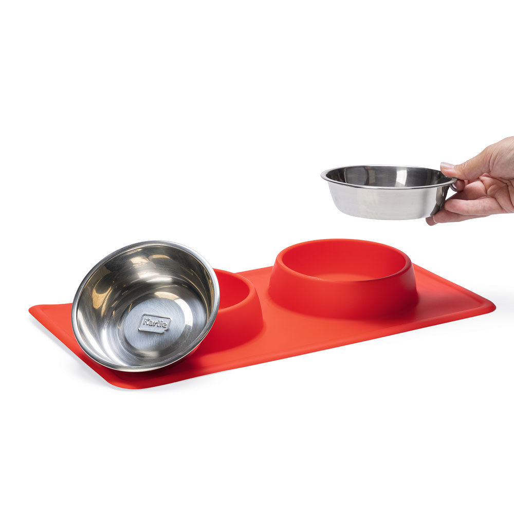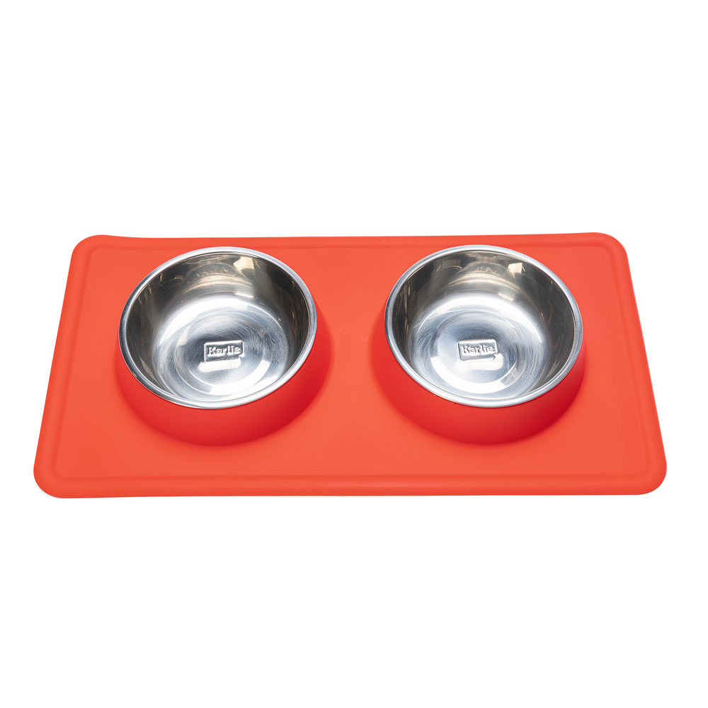 Mit dem Diner Set Dex von Karlie können Sie Ihren Hund mit Futter und Wasser versorgen. Dieses Set hat 2 herausnehmbare Edelstahlschüsseln. Diese Edelstahlschüsseln können in der Spülmaschine gereinigt werden. Edelstahl sorgt dafür, dass der Geruch von Hundefutter nicht aufgenommen wird. Der Rand von Dex ist aus rutschfestem Silikon, damit die Schale an Ort und Stelle bleibt. Außerdem sammelt die Silikonschale verschüttetes Wasser und/oder Futter auf.