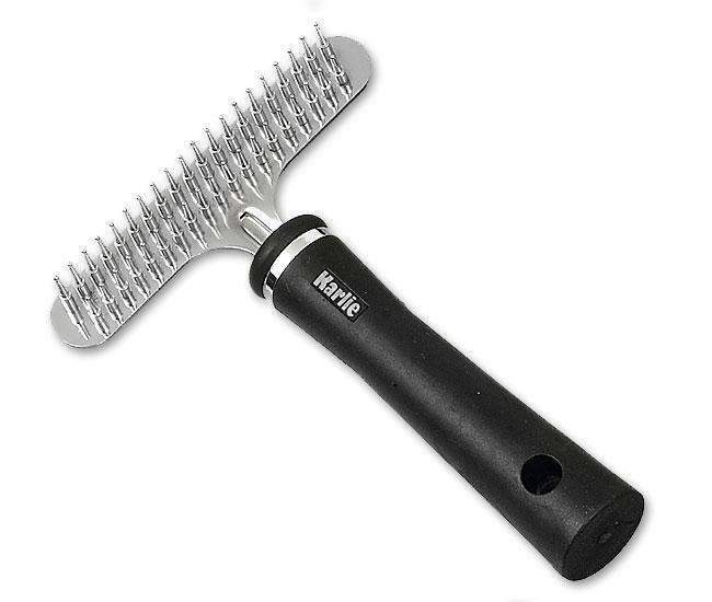 Zweireihiger Fellstriegel mit kurzen und langen hartverchromten Stiften für Hunde mit langem Fell aus der Karlie Perfect Care Pflegeserie.