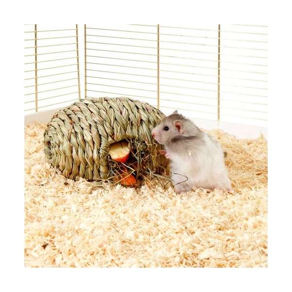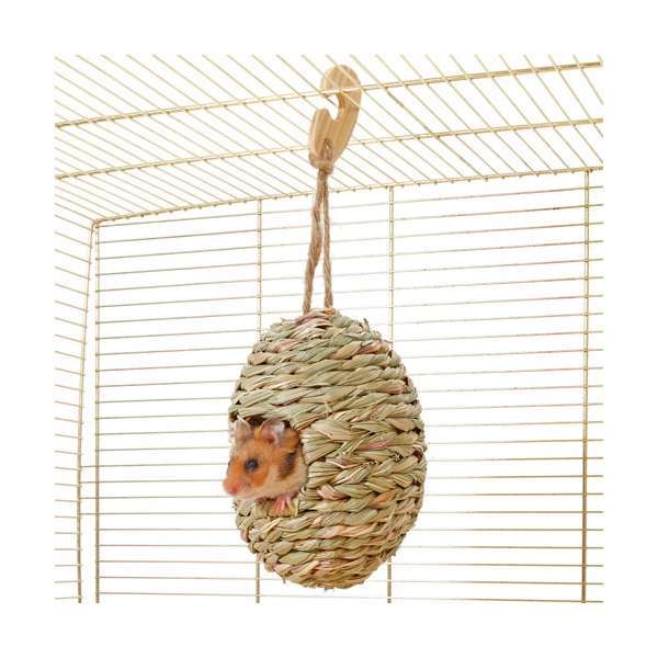 Dieses ovale Grasnest eignet sich ideal als Schlafhaus oder als Spielzeug zum Befüllen mit Heu, Kräutern oder anderen Snacks. Das Nest ist mit einem Seil und einem Haken aus Holz versehen, so dass es entweder ins Käfiggitter eingehangen oder einfach auf den Käfigboden gelegt werden kann. Das Grasnest ist 100 % natürlich und verdaulich.