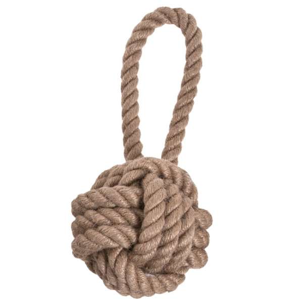 Die Jute-Schleuder besteht aus einem Jute-Ball mit einem Durchmesser von ca. 8,5 cm, der mit einer Schlaufe mit einer Länge von ca. 17 cm bestückt ist. Die Gesamtlänge inkl. Ball beträgt ca. 25 cm.