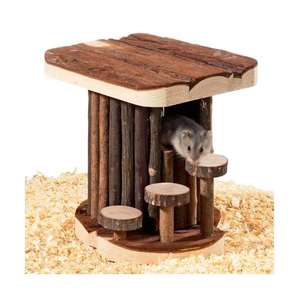 Der Kletterturm Fit Tower besteht aus Echtholz und eignet sich für Hamster, Mäuse und ähnlich große Nager. Im Inneren des Turm befinden sich zwei Etagen, die durch ein Loch miteinander verbunden sind. Jede Etage besitzt einen Ein- bzw. Ausgang nach außen hin, der obere Eingang kann über die Treppenstufen erreicht werden.