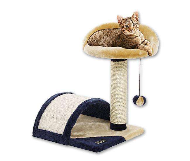 Der Karlie Kratzbaum Max besteht aus einer Bodenplatte, einem Sisal-Kratzstamm, einem Tunnel mit Kratzfläche und einer weichen Liegeplatte.