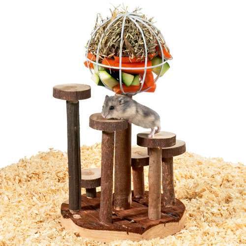 Kletterspaß und Futterhalter in einem bietet die Rody Dinner World Ihrem Kleinnager. Über die Treppenstufen muss sich das Tierchen erstmal nach oben vorarbeiten, wird dort aber dann durch leckeres Futter, das Sie nach Herzenslust auswählen können, belohnt. Der Futterball kann nach Belieben mit Heu, frischem Gemüse, leckerem Obst und allen anderen denkbaren Leckereien befüllt werden.