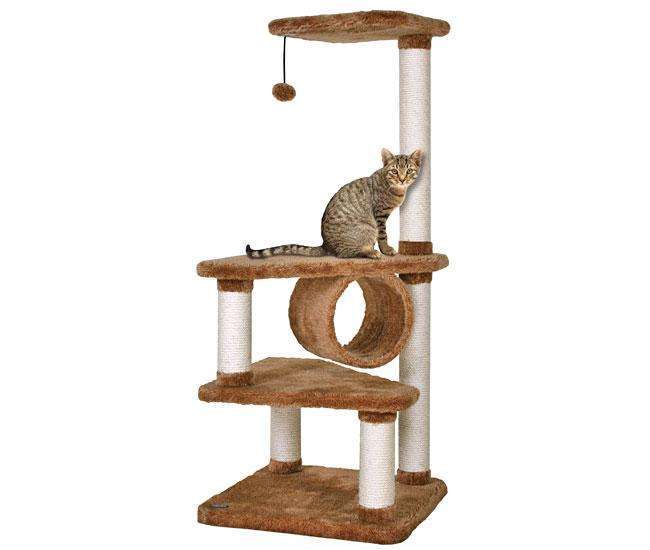 Die Platten und die Röhre sind mit Plüsch bezogen und bieten so bequeme Schlafplätze, während die Sisal-Kratzstämme für eine gute Möglichkeit zum Krallenschärfen sorgen. Ein Spielball, der mit einem Gummiband am Baum befestigt ist, sorgt für Spielvergnügen.