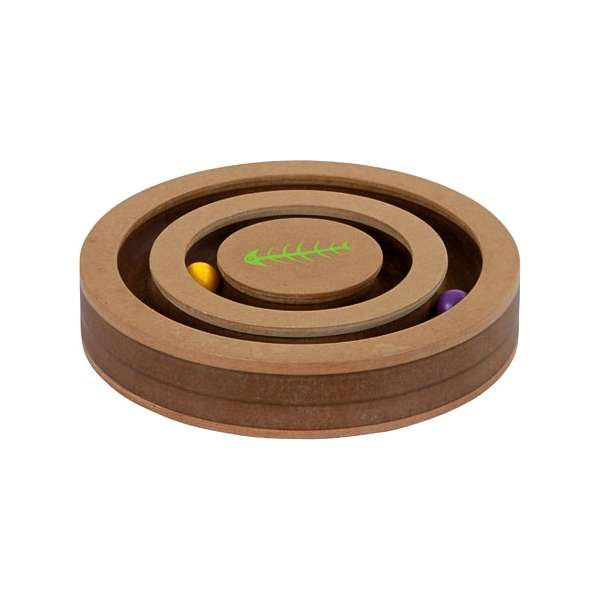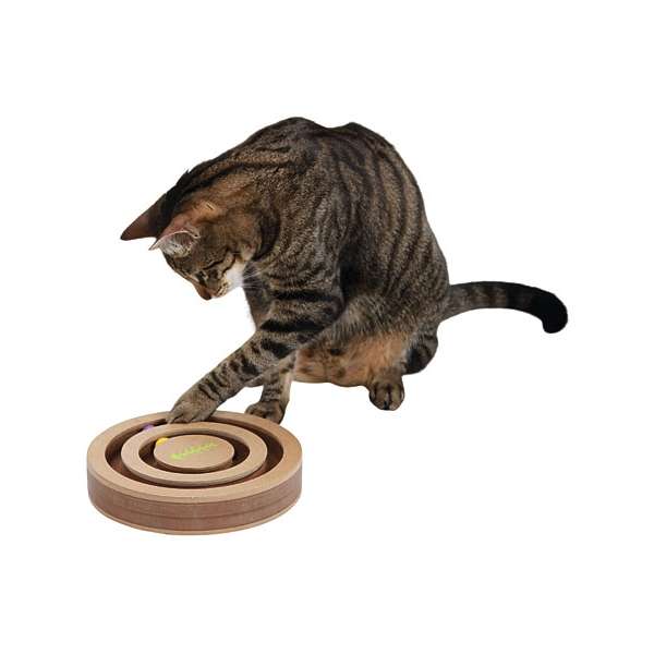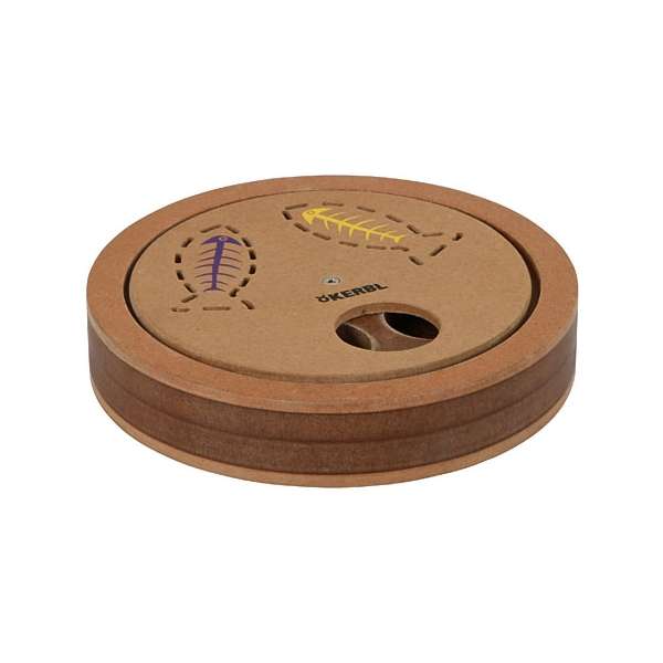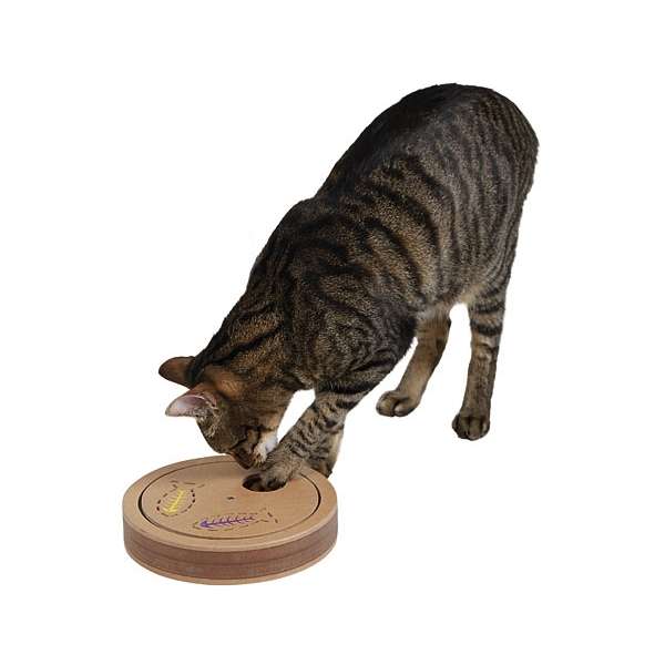 Auf der anderen Seite befindet sich ein Intelligenzspiel, in dem Leckerchen versteckt werden können. Ihre Katze muss die Drehscheibe bewegen, um an ihre Belohnung zu kommen.