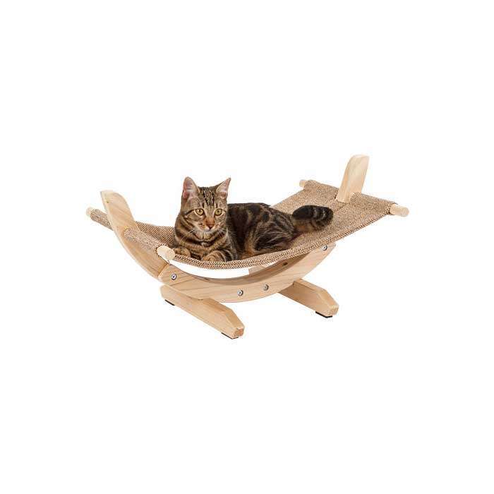 Auf das Naturholz-Gestell ist eine Matte aus Leinen aufgezogen, welche fixiert ist, damit auch eher ängstliche Katzen die Liegefläche gerne nutzen. Die Hängematte wird zur einfachen Selbstmontage in Einzelteilen geliefert.