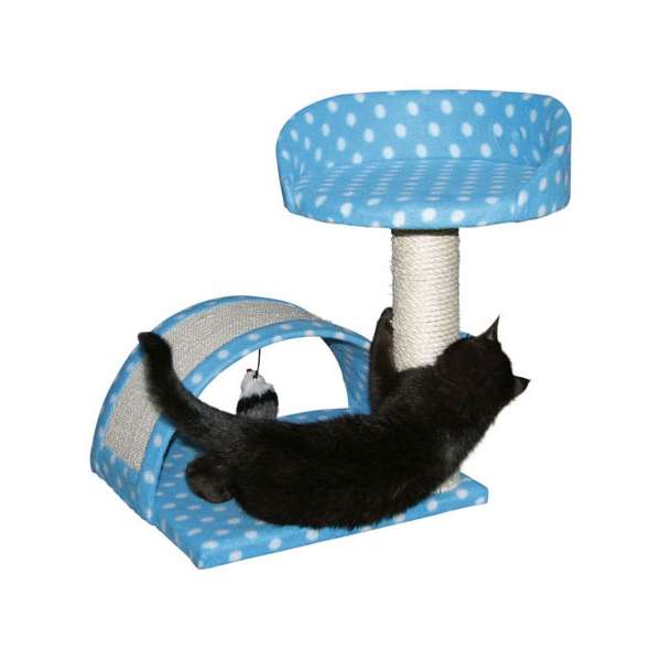 Er besteht aus einem gebogenen Kratzbrett, einem Sisalstamm zum Krallenschärfen und einer gepolsterten Liegeplatte mit Rand. Außerdem ist eine Spielmaus am Gummiband vorhanden. Das moderne hellblaue Pünktchenmuster macht den Kratzbaum zum frechen Eyecatcher in jeder Wohnung.