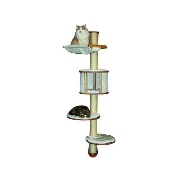Die Liegeflächen des Kratzbaum Dolomit bestehen aus Holz und sind mit Plüschkissen ausgestattet, die mit Klettverschlüssen befestigt werden und somit abnehmbar sind. Das Sisal ist an den Säulen verklebt.