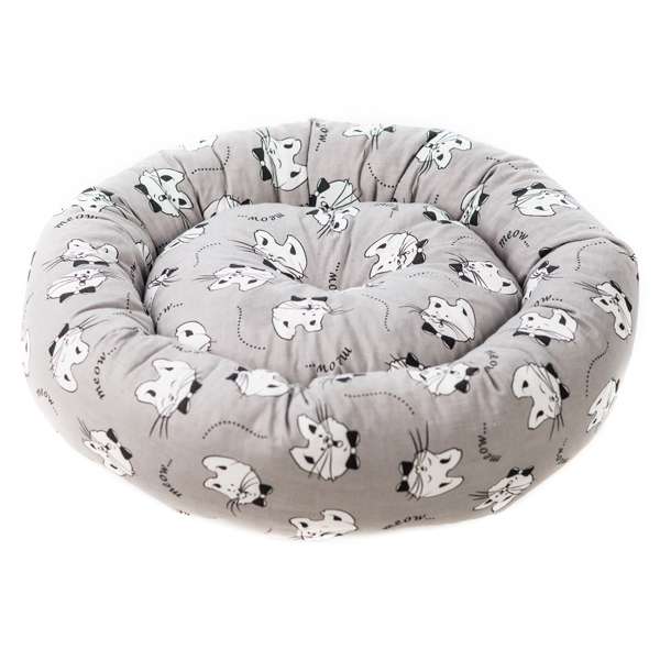 Hochwertiges rundes Bettchen für Katzen oder kleine Hunde in toller Optik: grau mit Katzenköpfen.