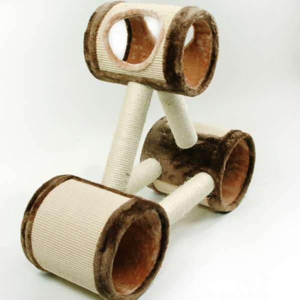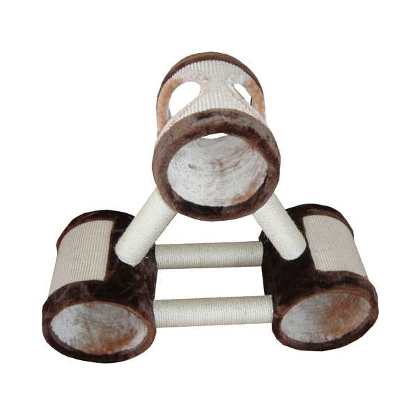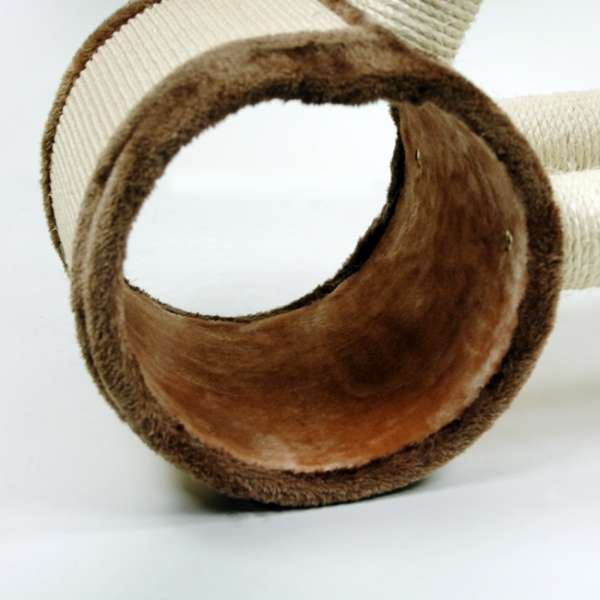 Die obere Rolle ist mit zwei seiltlichen Löchern (ca. 16 cm Durchmesser) bestückt, die das Spiel noch interessanter machen. Alle drei Rollen sind durch insgesamt vier Sisalstämme verbunden, welche selbstverständlich auch als Kratzfläche dienen und den gesamten Kratzbaum stabil zusammenhalten. Die Stämme haben einen Durchmesser von ca. 7 cm. Das Plüsch der Rollen ist jeweils an den Außenseiten braun, während die Innenseiten und die Umrandungen der Löcher an der oberen Rolle mit beigem Plüsch bezogen sind.