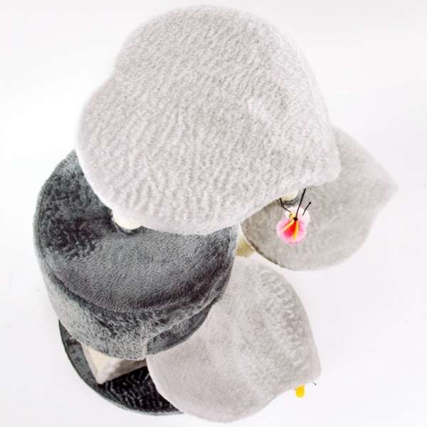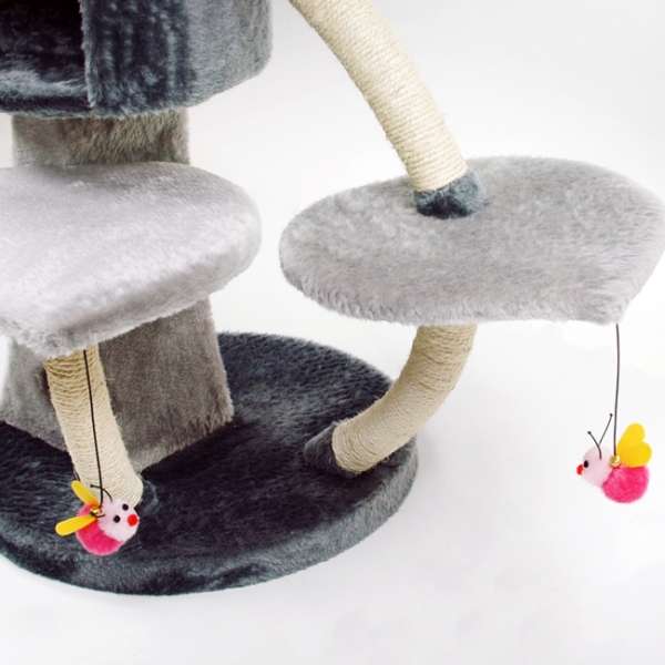 Im gleichen Element, welches von innen hohl ist, befindet sich vorne ein kleines Löchlein, hinter dem sich ein Plüschball mit Glöckchen an einem Gummiband versteckt. Da ist der Spielspaß vorprogrammiert! Doch als ob das nicht schon reichen würde, verzieren zusätzlich noch drei rosafarbene Plüschbienchen den Kratzbaum, die ebenfalls an Gummibändern befestigt und mit Glöckchen ausgestattet sind.