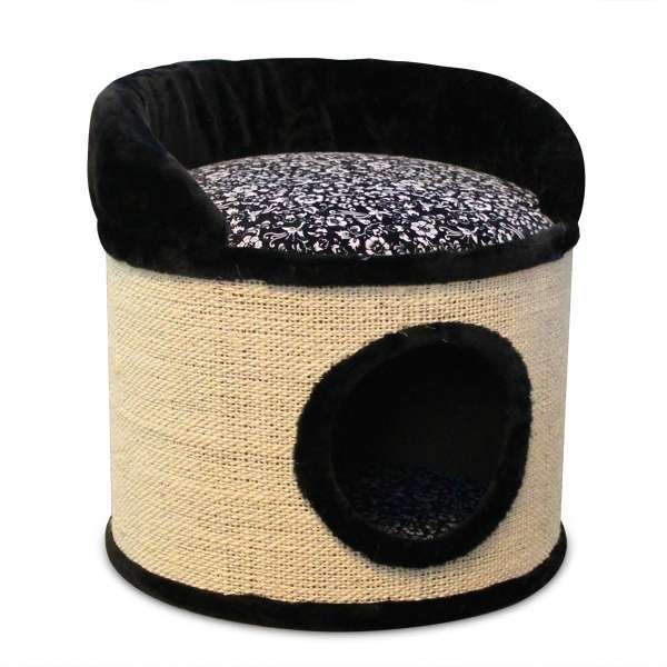 Der Rand, sowie der Höhleneingang sind mit schwarzem Plüsch ausgestattet, während die Liegefläche und der Boden der Höhle mit einem Stoff mit floralem Muster bezogen sind. Von außen ist die Tonne komplett mit Sisal bestückt, an dem Ihr Stubentiger seine Krallen schärfen kann.