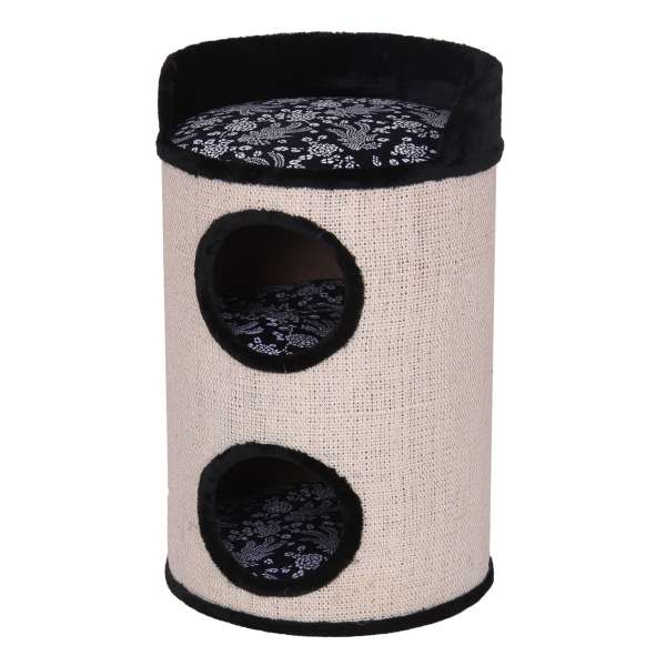 Der Rand, sowie die Höhleneingänge sind mit schwarzem Plüsch ausgestattet, während die Liegeflächen, der Boden der Höhlen und die beiden Kissen mit einem Stoff mit floralem Muster bezogen sind. Von außen ist die Tonne komplett mit Sisal bestückt, an dem Ihr Stubentiger seine Krallen schärfen kann.