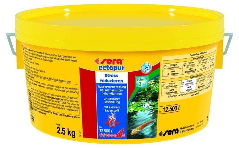 Wasserpflege während der Behandlung von Ektoparasiten und Pilzen sera ectopur ist ein Salzpräparat, das verschiedene medikamentöse Behandlungen sinnvoll ergänzen kann (insbesondere z. B. Samtkrankheit, Verpilzungen, Verletzungen, Befall durch Ektoparasiten ? Einzeller, Plattwürmer, Fischegel, parasitische Krebstiere). Das Mittel setzt desinfizierenden Sauerstoff frei, wodurch die Atmung der kranken Fische erleichtert wird. Weiterhin erhöht es den Salzgehalt und regt so die Schleimhautbildung an. Auf diese Weise wird die Heilung unterstützt. Bevor hohe Salzkonzentrationen (z. B. im Kurzbad) angewendet werden, sollte immer erst die Salztoleranz der jeweiligen Fischart überprüft werden.