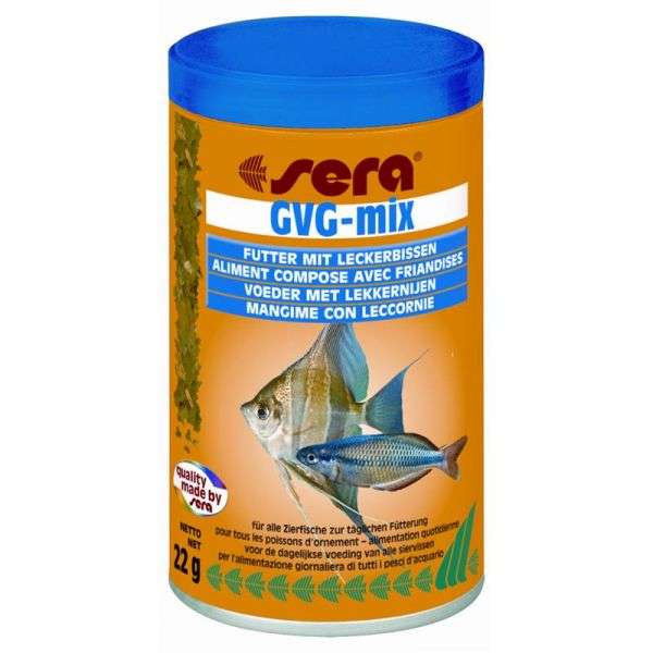 sera GVG-mix besteht zu 80 % aus einer Spezialflocke, die aus Meeresalgen, gemahlenem Krill und Plankton hergestellt wird. 20 % bestehen aus gefriervakuumgetrockneten (GVG, FD) Mückenlarven, Daphnien und Artemia-Shrimps.
