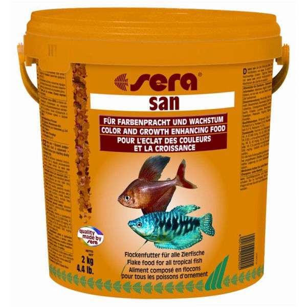 sera san für Farbenpracht bei allen Zierfischen. Flockenfutter mit Fisch- und Getreidemehl sowie Seealgen und Spirulina. Die ausgewogene Zusammensetzung und der hohe Protein- sowie Vitamingehalt führen zu hervorragendem und gesundem Wachstum. sera san verbessert die Zuchtergebnisse und wird auch von heiklen Fischen gerne angenommen.