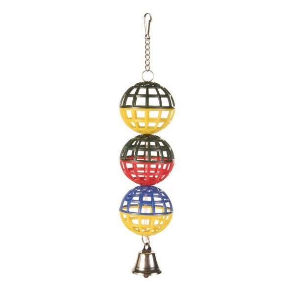 Der 3er Gitterball besteht aus Kunststoff und wird einfach mithilfe der Kette mit Haken im Käfiggitter befestigt. Ein Glöckchen unten macht das Spielen noch interessanter.