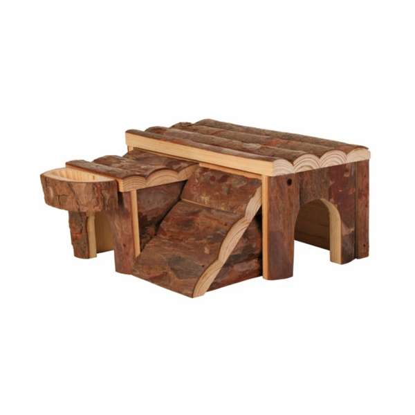 Das Hamsterhaus Luka hat zwei Eingänge, über die jeweils ein Trog gehängt werden kann. Die Rampe hilft dem Hamster, auf das Dach und somit an die Futtertröge zu kommen. Das Haus besteht aus Echtholz und eignet sich für Hamster und Mäuse.