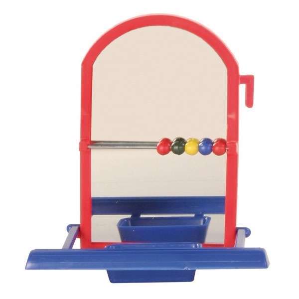 Beschäftigung für kleine Vogelarten bietet dieser Landespiegel mit Kunststoffrahmen zum Einhängen ins Käfiggitter. Mit Sitzstange, kleinem Napf und Perlen zum Spielen.