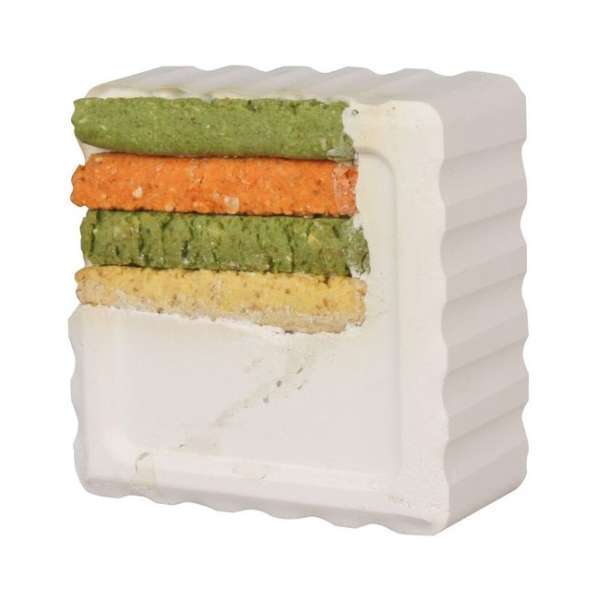 Der Nagerstein mit Getreidestangen und wertvollem Seetang versorgt Kaninchen sowie Kleinnager mit lebenswichtigen Mineralstoffen und Spurenelementen. Die leckeren Stangen regen zum Nagen an und unterstützen somit den natürlichen Nagetrieb. Der Nagestein ist ein reines Naturprodukt und schützt, pflegt und festigt das Gebiss. Der wertvolle Seetangzusatz verleiht dem Fell einen seidigen Glanz und steigert das Wohlbefinden. Der Nagestein sollte in keinem Käfig fehlen. Mit Halter zur Befestigung im Käfiggitter.