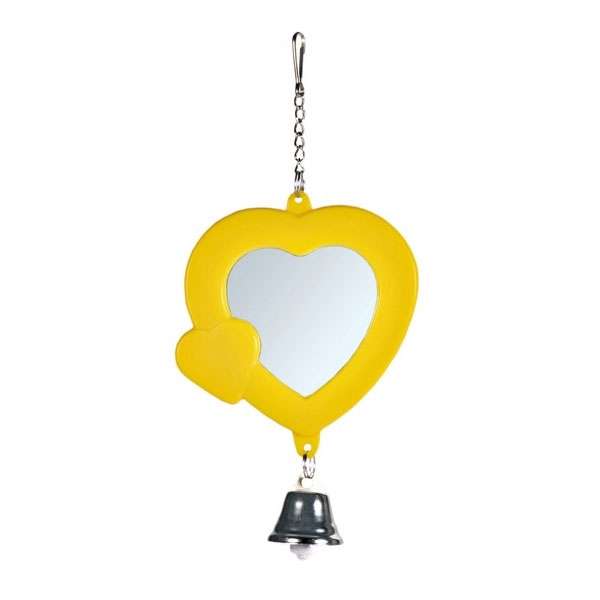 Niedlicher Spiegel für kleine Vögel in Herzform. Mit Kunststoffrahmen, Glocke und Kette zur Befestigung im Käfiggitter.