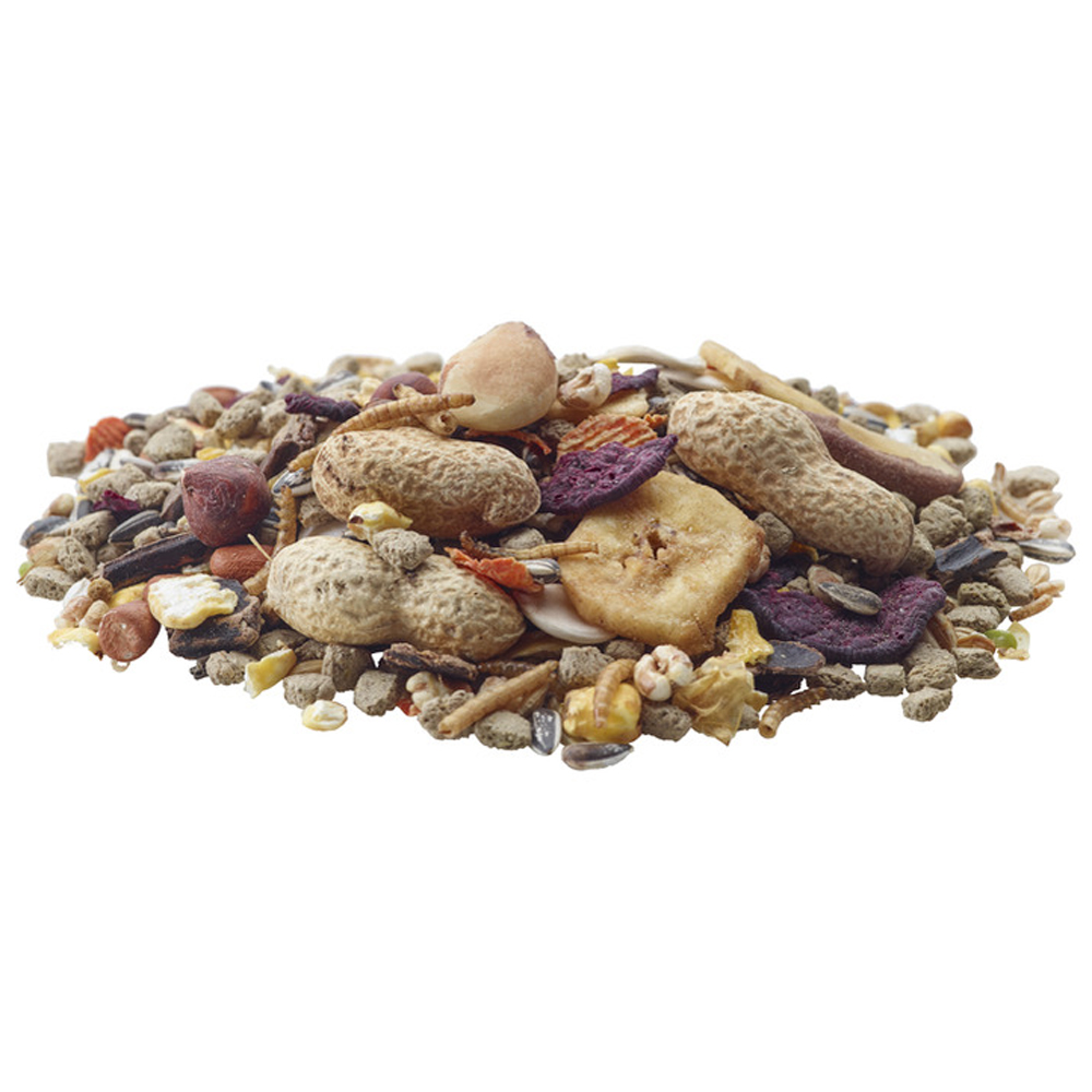 Getreide, Saaten (Sonnenblumenkerne 9%), Nüsse (Erdnüsse 12%), pflanzliche Nebenerzeugnisse, Gemüse (Erbsen 8,5%), pflanzliche Eiweißextrakte, Früchte (Banane 1%), Insekten (Mehlwürmer 4%), Mineralstoffe, Hefen, MOS, FOS, Calendula, Traubenkerne