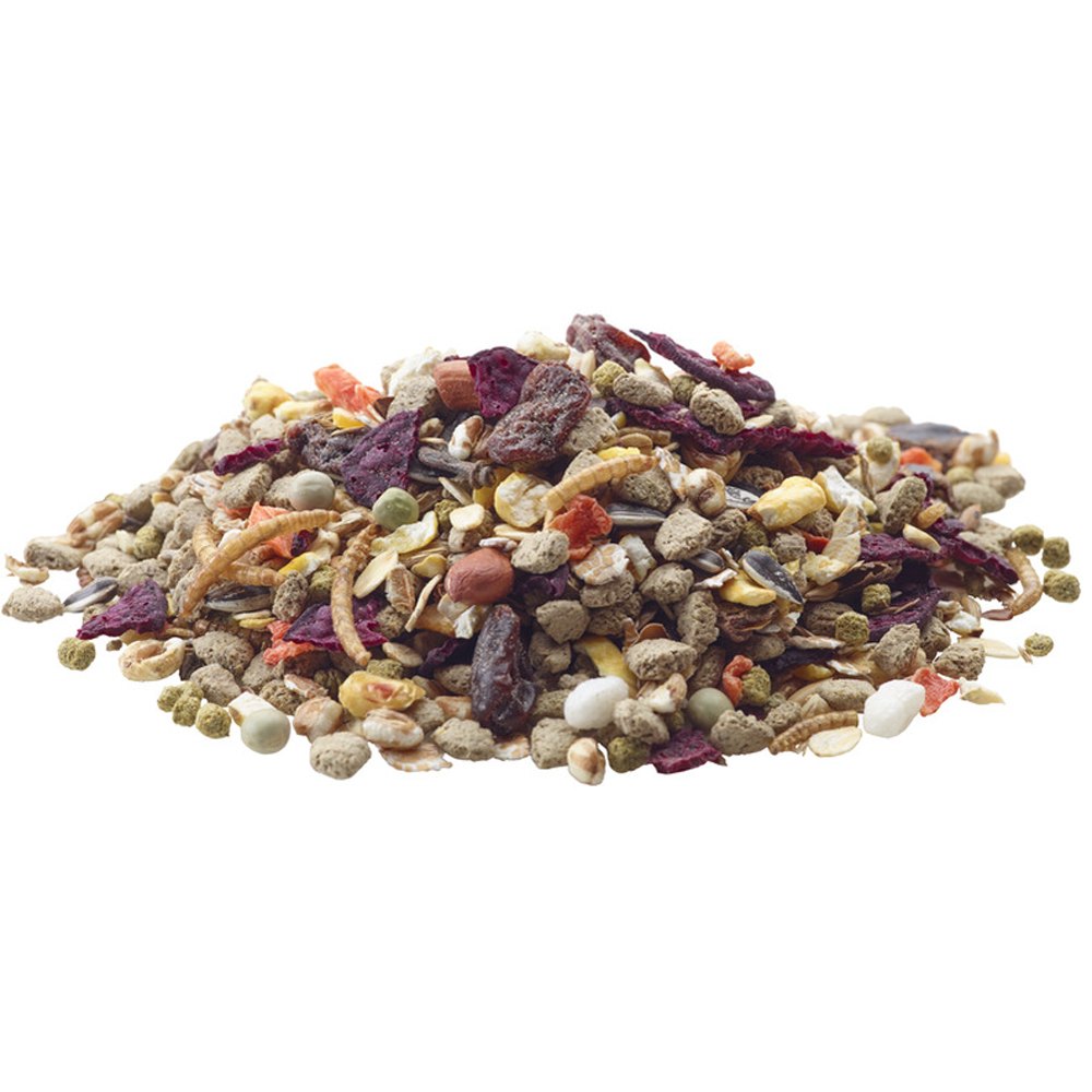 Getreide (Weizen 8,5%), pflanzliche Nebenerzeugnisse, Gemüse (Erbsen 7,5%, Rote Bete 3%, Karotten 2%), Saaten, Früchte (Rosinen 3%), pflanzliche Eiweißextrakte, Insekten (Mehlwürmer 4%), Nüsse, Mineralstoffe, Kräuter, MOS, FOS, Calendula, TraubenkerneAnalytische Bestandteile